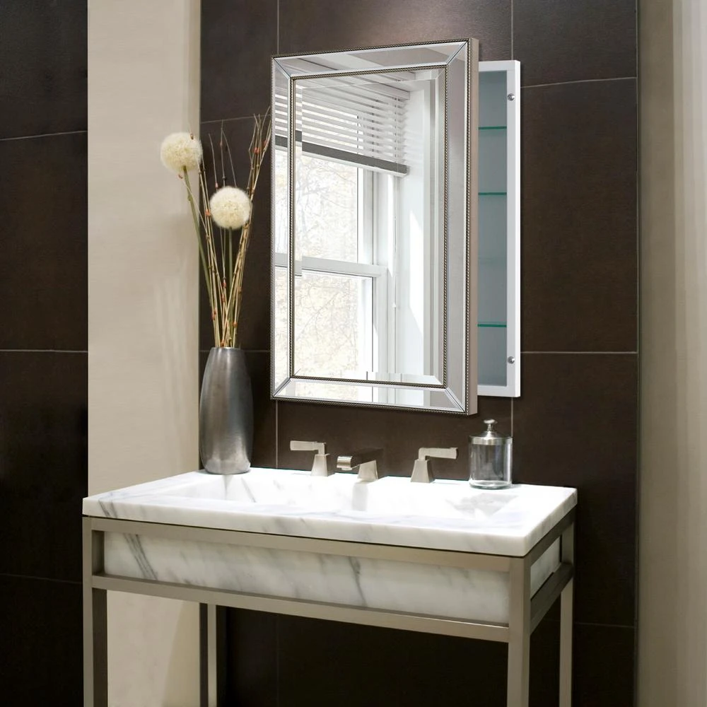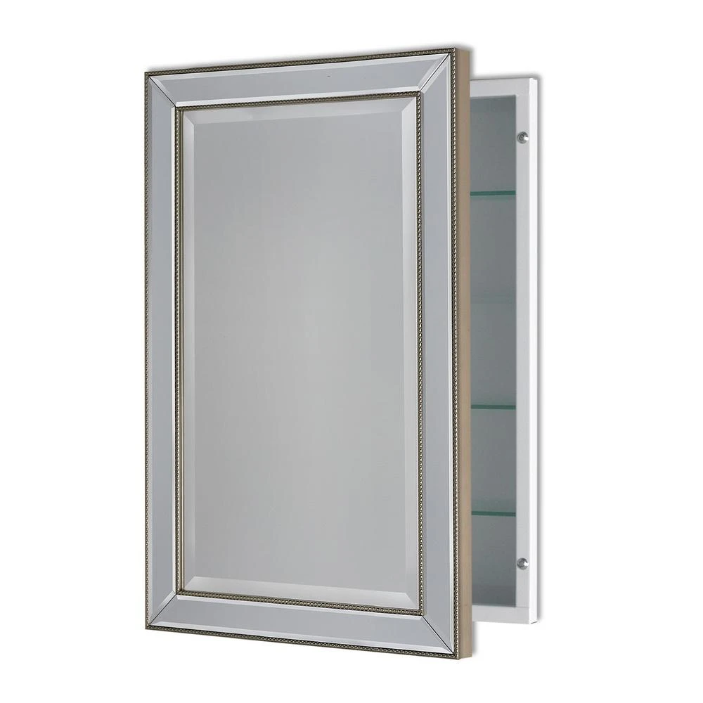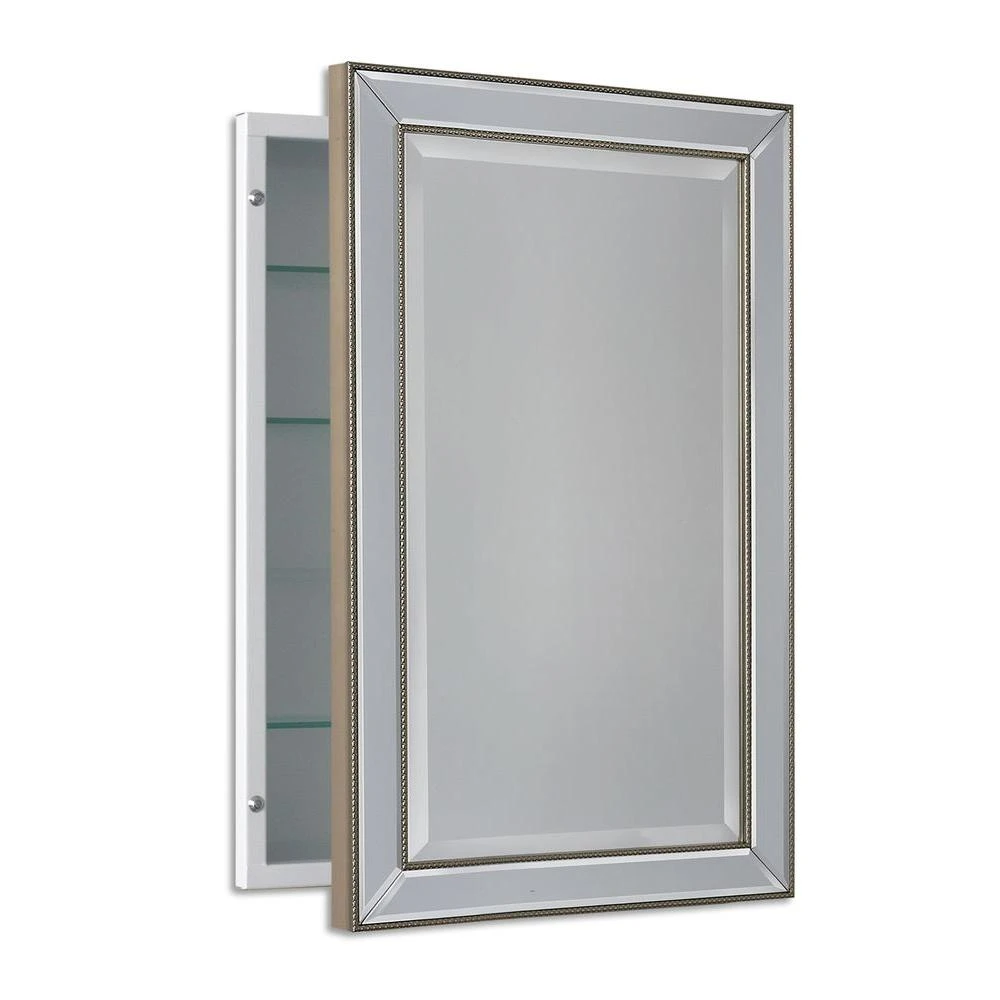 This 16 in. x 26 in. recessed medicine cabinet is a great way to brighten your bath decor. Cabinet features a beautifully hand crafted beveled mirror inlaid with quarter inch champagne beading. The reversible door opening offers installation flexibility and three adjustable glass shelves will accommodate your belonging.