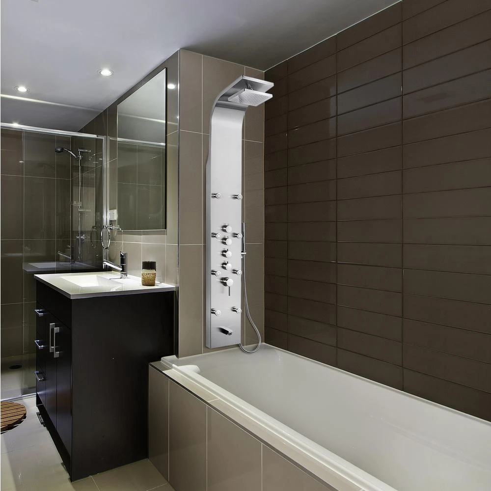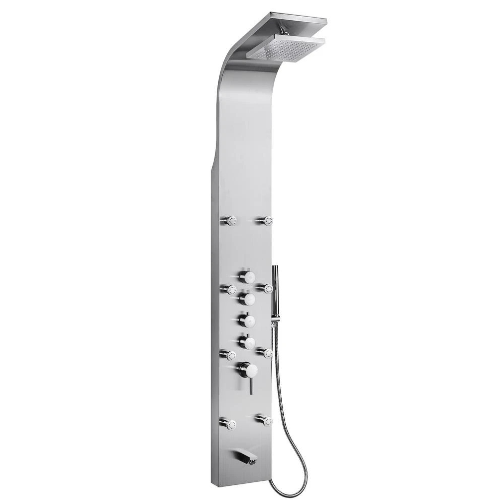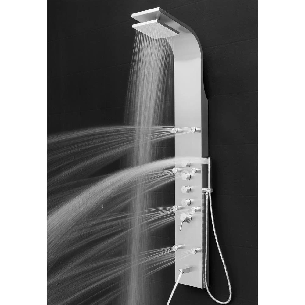 - Slimline luxury shower panel has built-in rainfall showerhead, high-powered body spray jets, and high-efficiency handheld shower wand