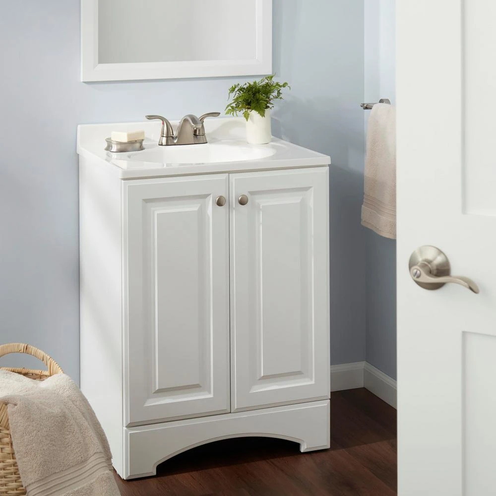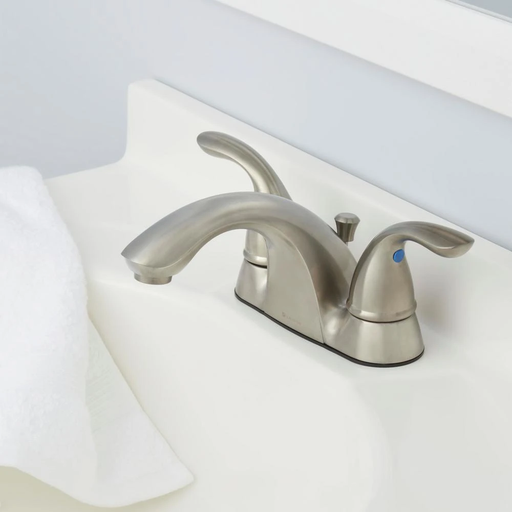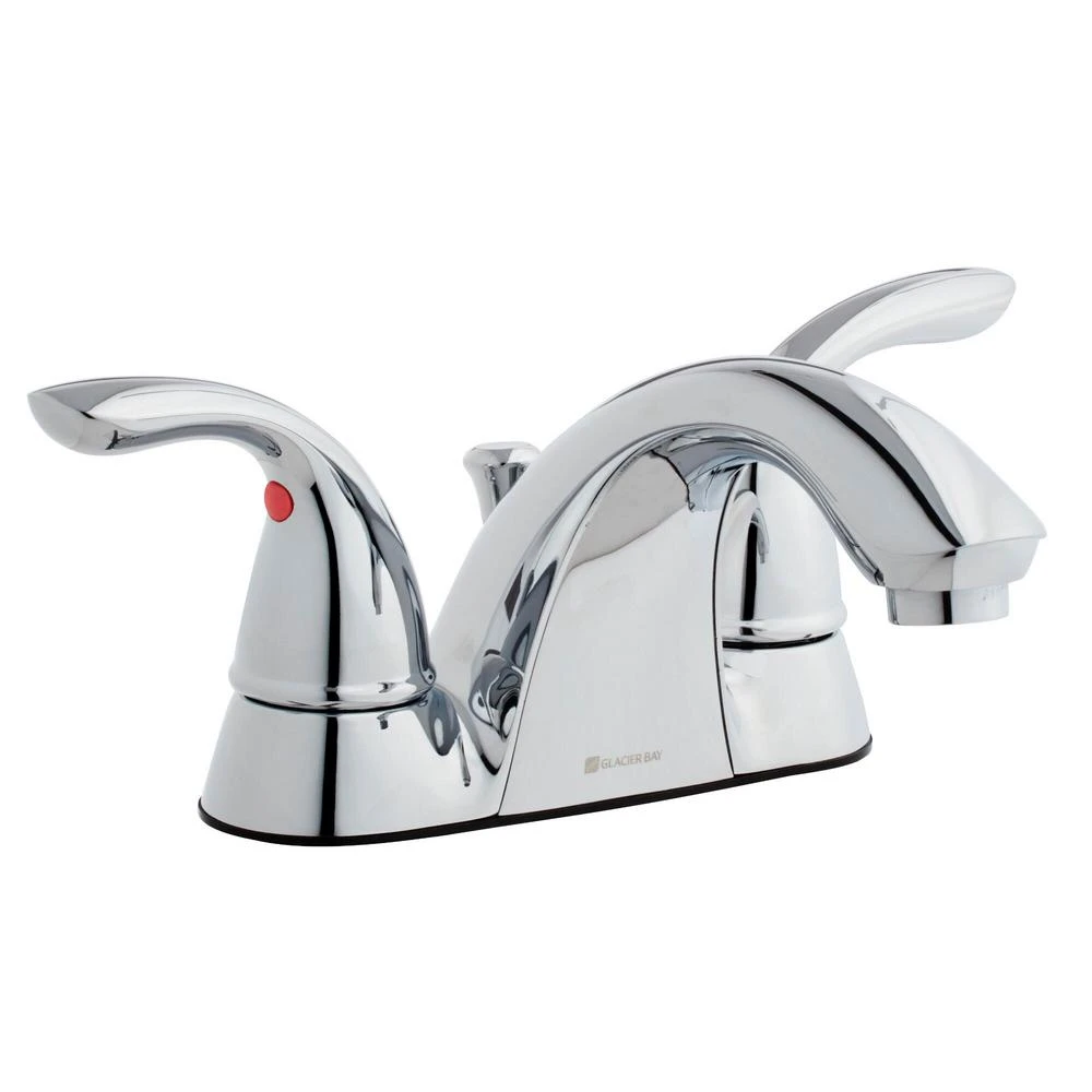The Glacier Bay Builders 4 in. Centerset 2-Handle Low-Arc Bathroom Faucet in Brushed Nickel has a sleek and shapely, curved design that will complement a wide variety of bathroom decor. WaterSense certified, this faucet has a 1.2 GPM water flow rate to help conserve water and ceramic disc cartridges to help prevent drips. The 2-handle lever design allows you to easily turn hot and cold water on and off. Durable with a brushed nickel finish, this faucet is easy to clean and easy to install with a 1/2 in. connection size and deck-plate mount. it also features the Glacier Bay exclusive ClickInstall drain assembly for quick and simple installation. Pair with other pieces from the Builders Collection for a complete and polished look.