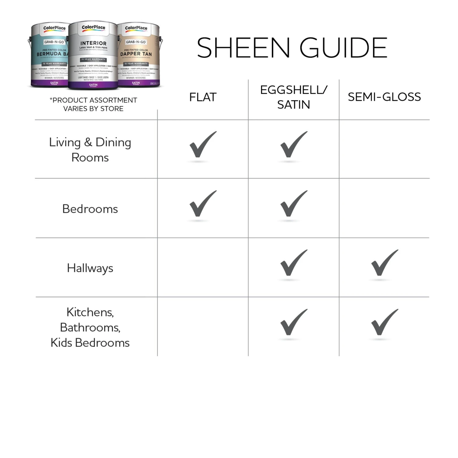 ColorPlace Pre Mixed Ready to Use Paints are ready-mixed (pre-tinted) paints, ready to go, available in a designer-inspired palette of top colors. These latex interior paints are a great value and a convenient option. Simply grab a can off the shelf and go with ColorPlacePre Mixed Ready to Use Paints. ColorPlace Pre Mixed Ready to Use Paint delivers a quick drying durable finish so you can get your space back to being enjoyed. ColorPlace Pre Mixed Ready to Use Paint provides easy application and easy clean up. Ideal for use on properly prepared interior walls, ceilings, or trim. Our suggestions for finish are as follows: a flat finish for living rooms and bedrooms; a satin finish for family rooms, kids rooms and hallways; and a semi-gloss finish for kitchens, bathrooms and hallways.
