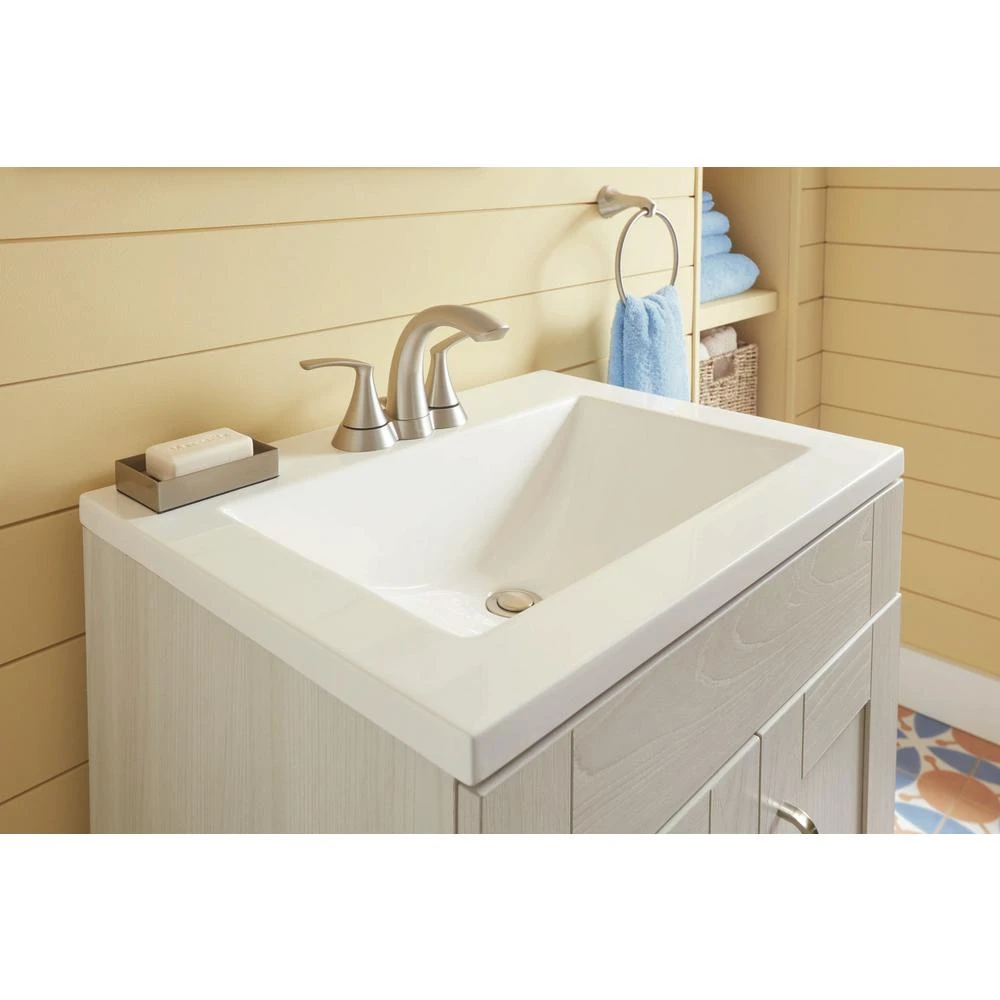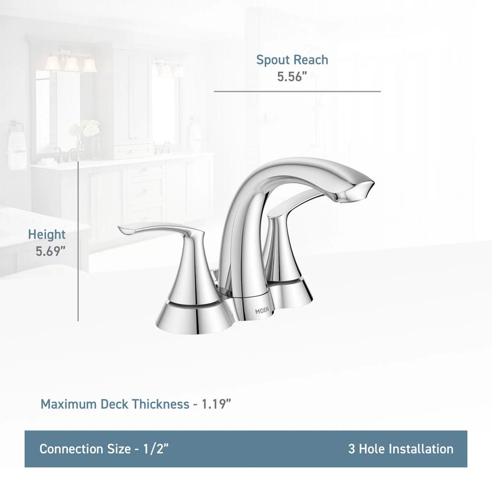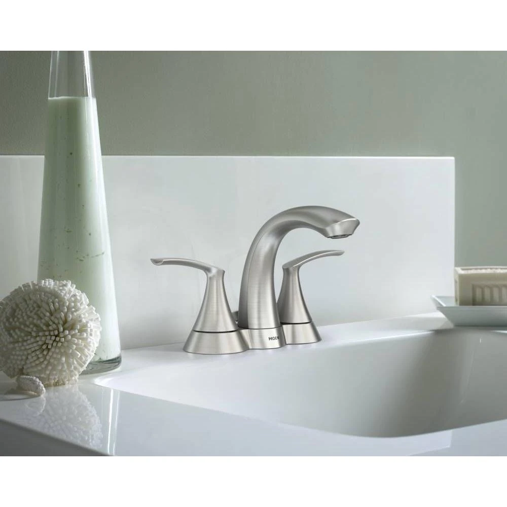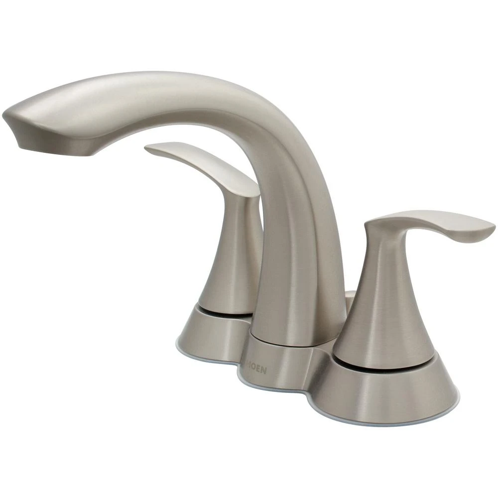 Featuring dazzling looks and a stylish, functional design, the MOEN Darcy 4 in. Centerset 2-Handle Bathroom Faucet will add a contemporary flair to your bathroom. Boasting a beautiful brushed nickel finish that bring the warm look of stainless to your bath, this faucet offers petal-like handles and a swan-like spout to bring a relaxed, luxurious feeling to your space. The Spot Resist Spot Resist finish resists fingerprints and water spots for easy maintenance and long-lasting shine.