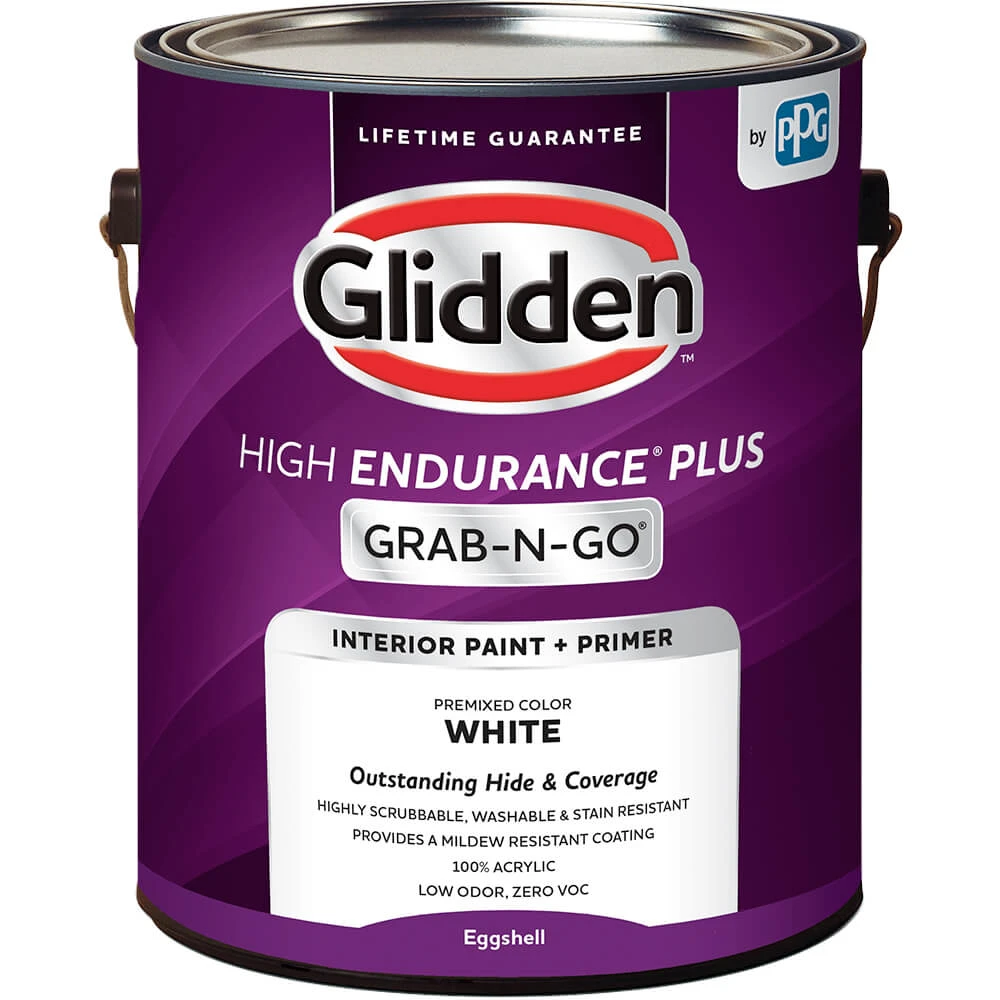 GLIDDEN HIGH ENDURANCE Plus GRAB-N-GO Interior Paint + Primer is a high quality, interior latex paint pre-tinted in our most popular paint colors so you can grab your paint right off the shelf and get painting fast. This low odor, Zero VOC paint provides outstanding hide and coverage and is highly scrubbable, washable and stain resistant. Glidden High Endurance Plus Grab-N-Go interior paint delivers a quick drying finish so you can get your space refreshed and back to being enjoyed. Ideal for use painting on properly prepared interior walls, ceilings, or trim and provides a mildew resistant coating for results that last. This pre-mixed interior paint and primer takes the hassle out of color selection and will help you bring out your true expression in your home. Glidden High Endurance Plus Grab-N-Go interior paint is an exceptional quality paint with optimal performance, offered at a great value. This interior paint is backed by a Lifetime Guarantee and is sure to bring you years of enjoyment.