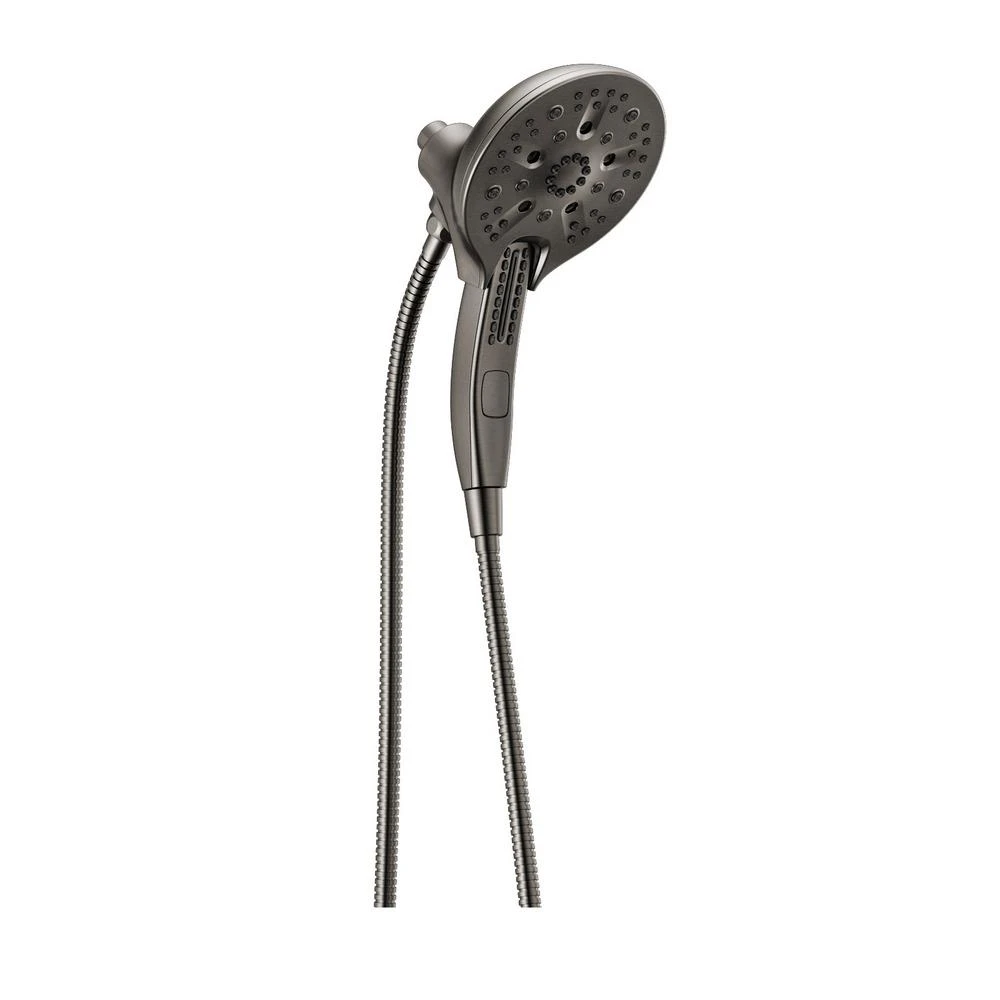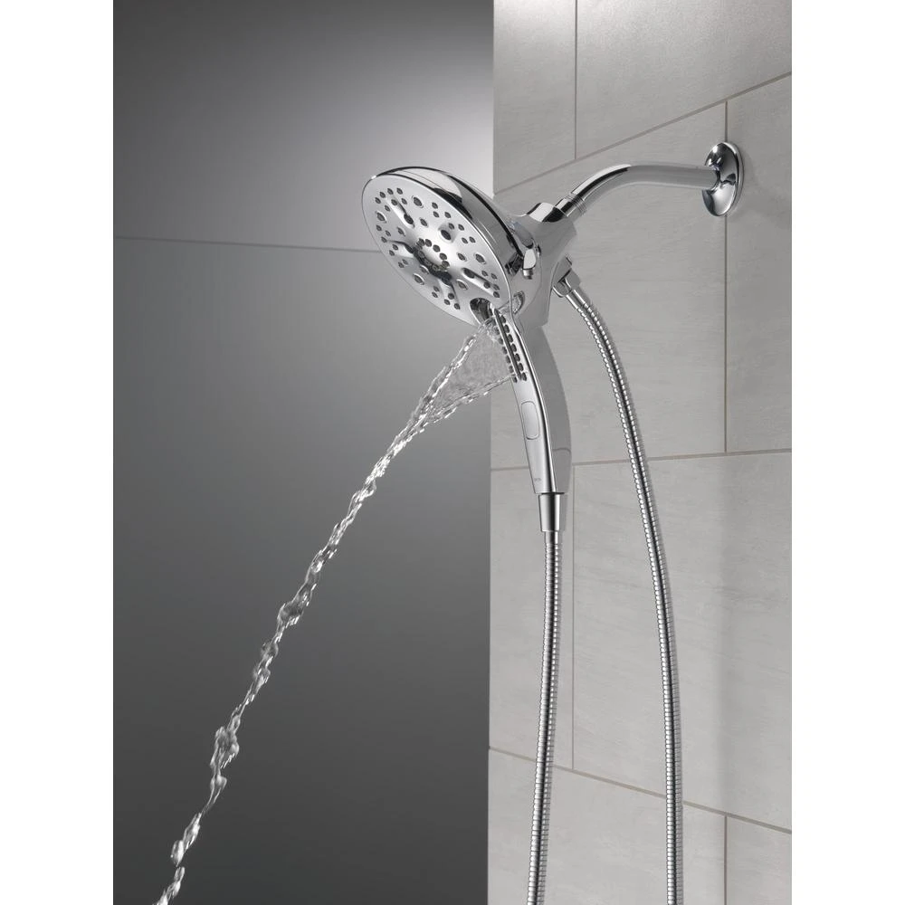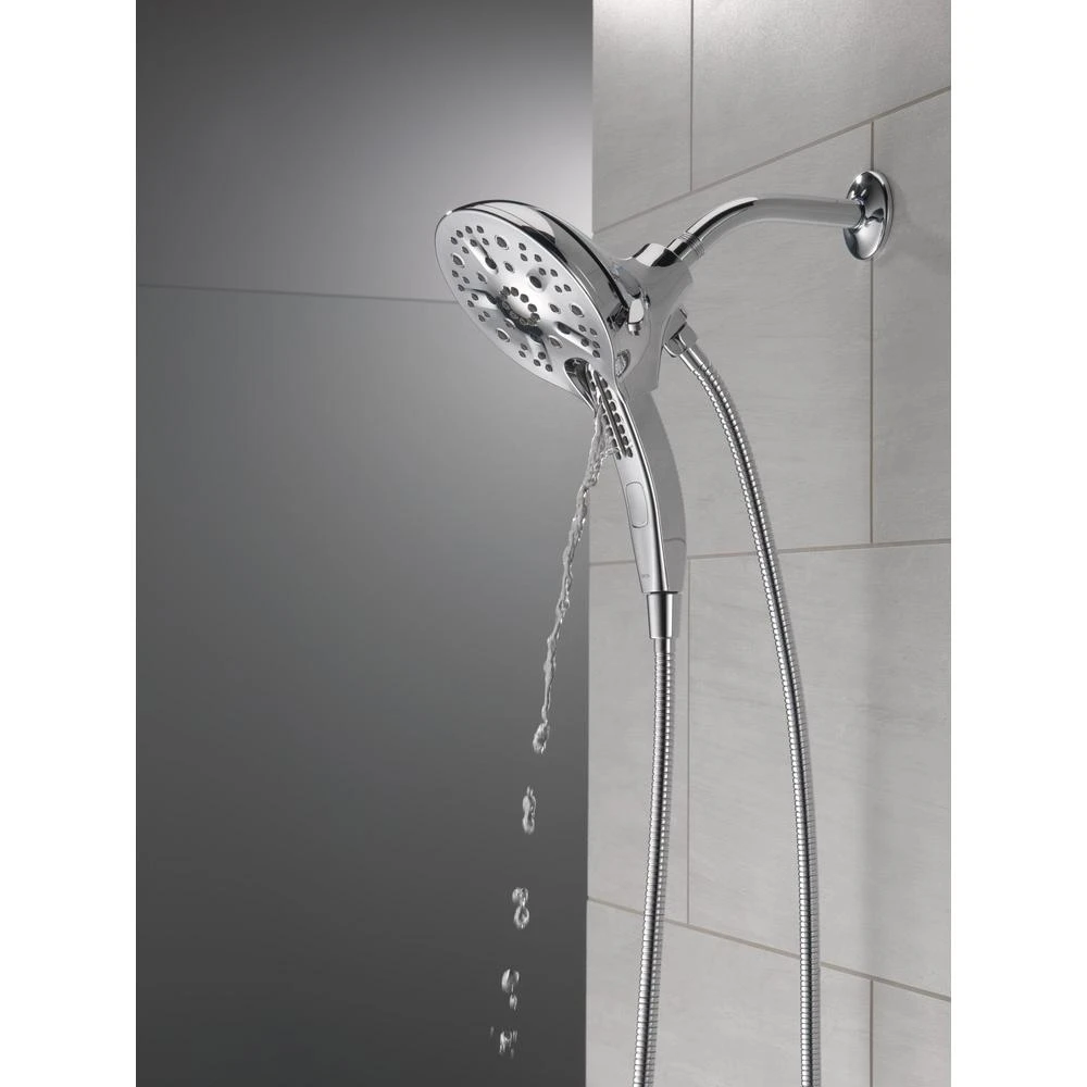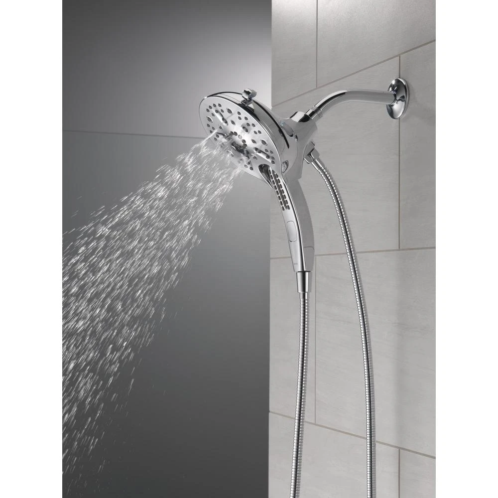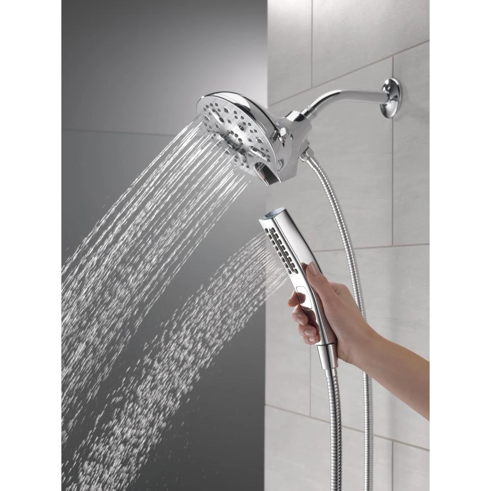 The Delta In2ition Two-in-One Shower features a detachable hand shower which can be used separately from or simultaneously with the shower head. This integrated dual-functionality gives you maximum flexibility without sacrificing warmth, as you can choose to have water streaming from the shower head only, the hand shower only or both the shower head and hand shower at once. Delta H2Okinetic PowerDrench Showers are powered by an innovative technology that sculpts the water into a unique wave pattern, giving you the feeling of more water without using more water and creating a shower with more warmth, coverage and intensity. So go ahead and indulge, because now you can enjoy the feeling of more water without using more water. Delta MagnaTite Docking uses a powerful integrated magnet to pull your faucet spray wand or In2ition hand shower precisely into place and hold it there so it stays docked when not in use. While other products may gather unsightly mineral build-up over time, Delta soft rubber Touch-Clean spray holes allow any mineral residue to simply be wiped away for an instantly refreshed look – with no need for soaking or the aid of chemical cleaners. The pause setting gives you ample space for shaving, lathering and other shower tasks, without worrying about overspray or water waste. This spray setting helps you conserve water, so you can worry less about depleting your supply of hot water – and you help the environment too.
