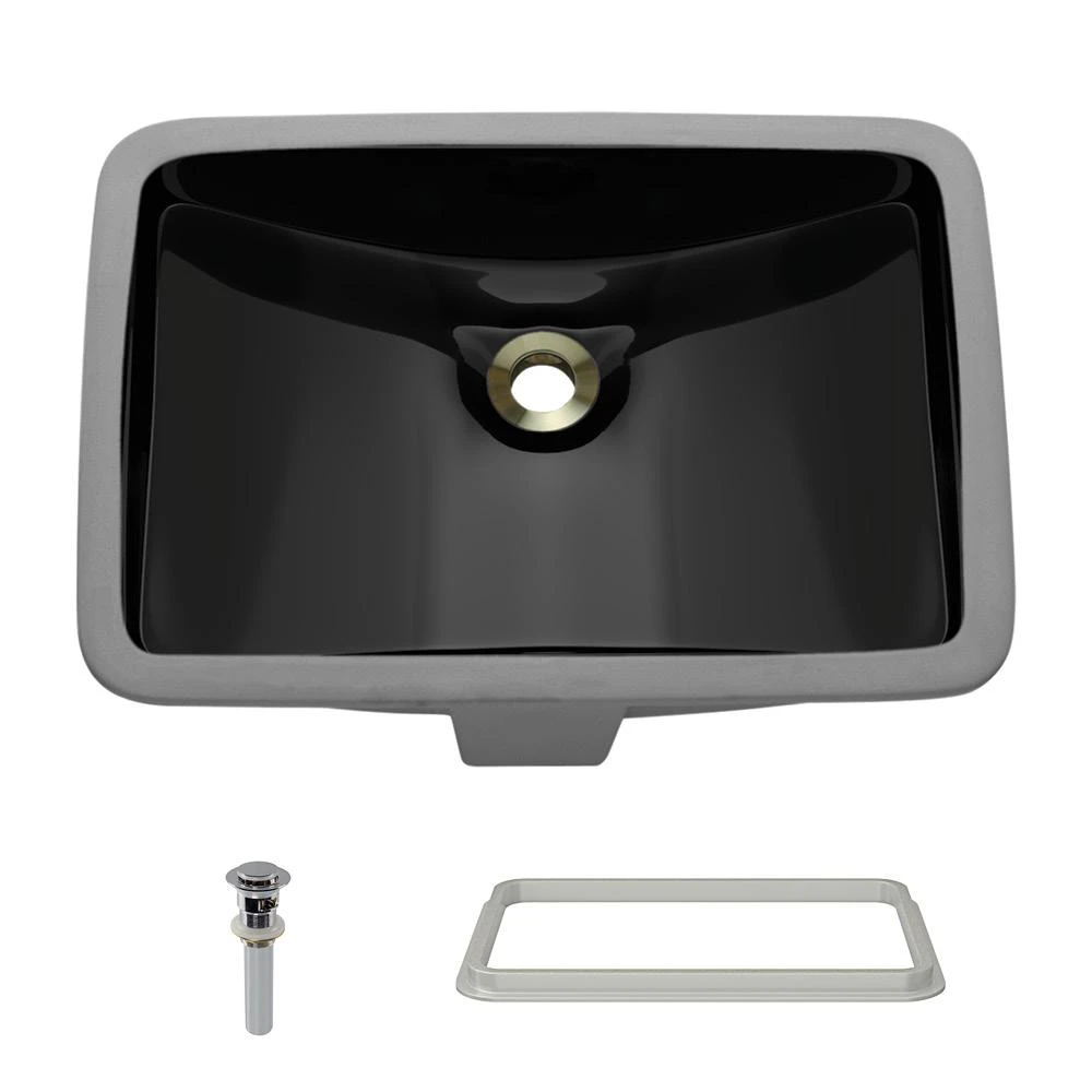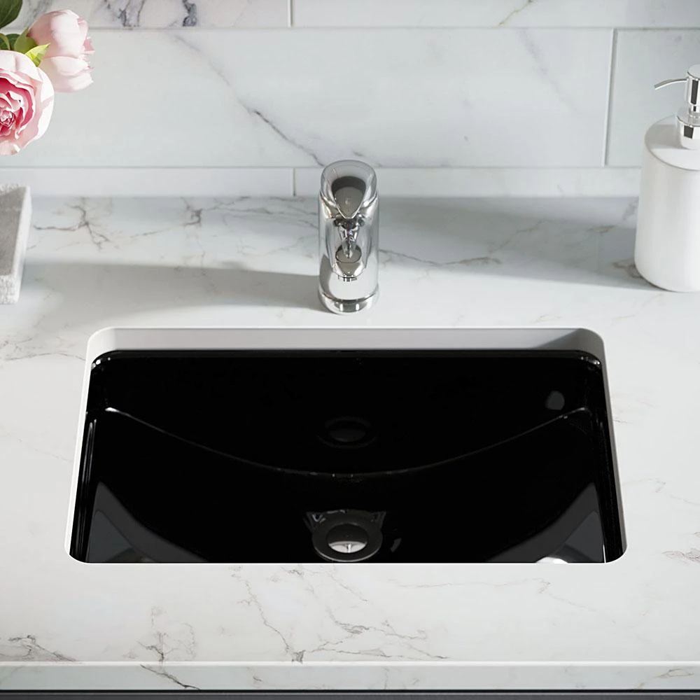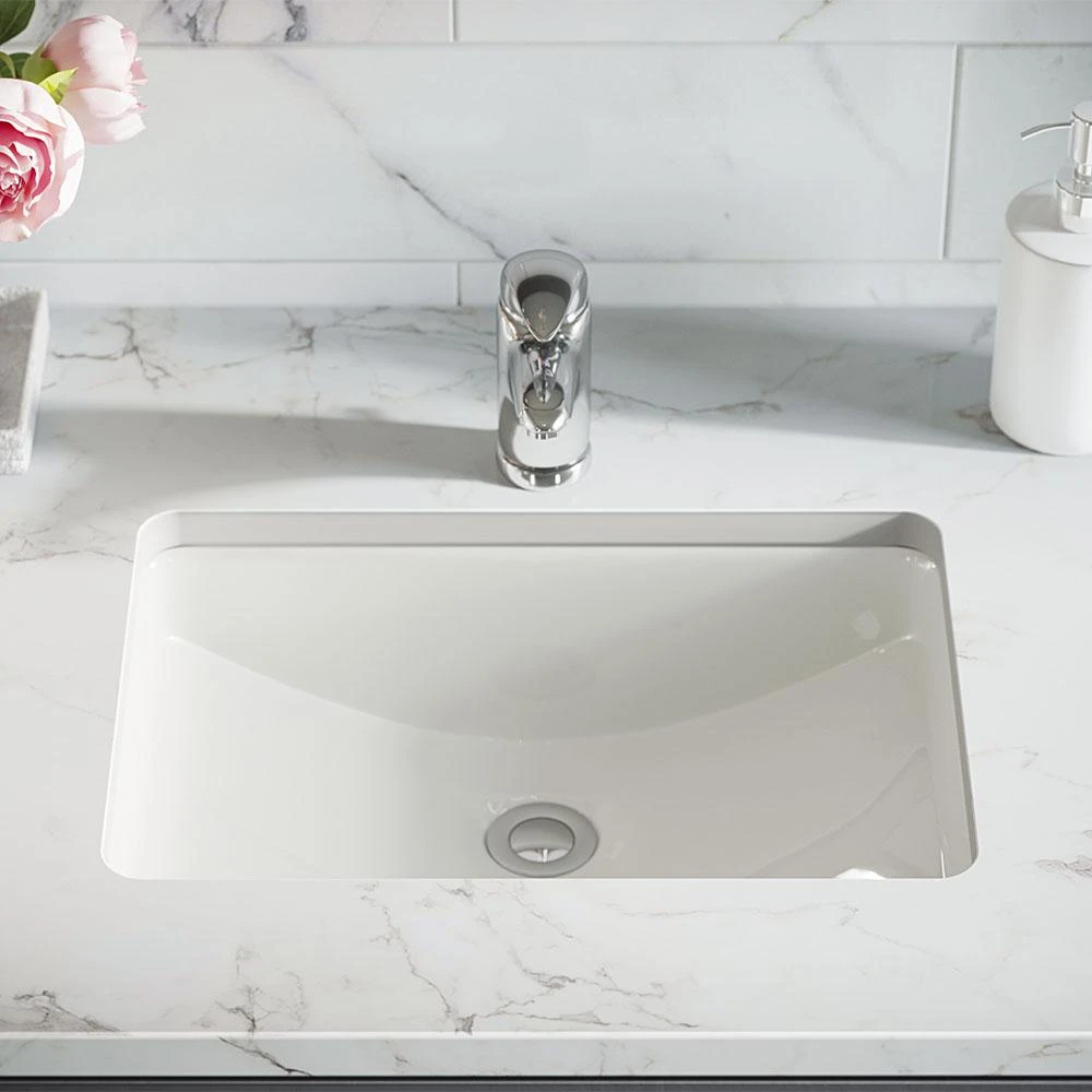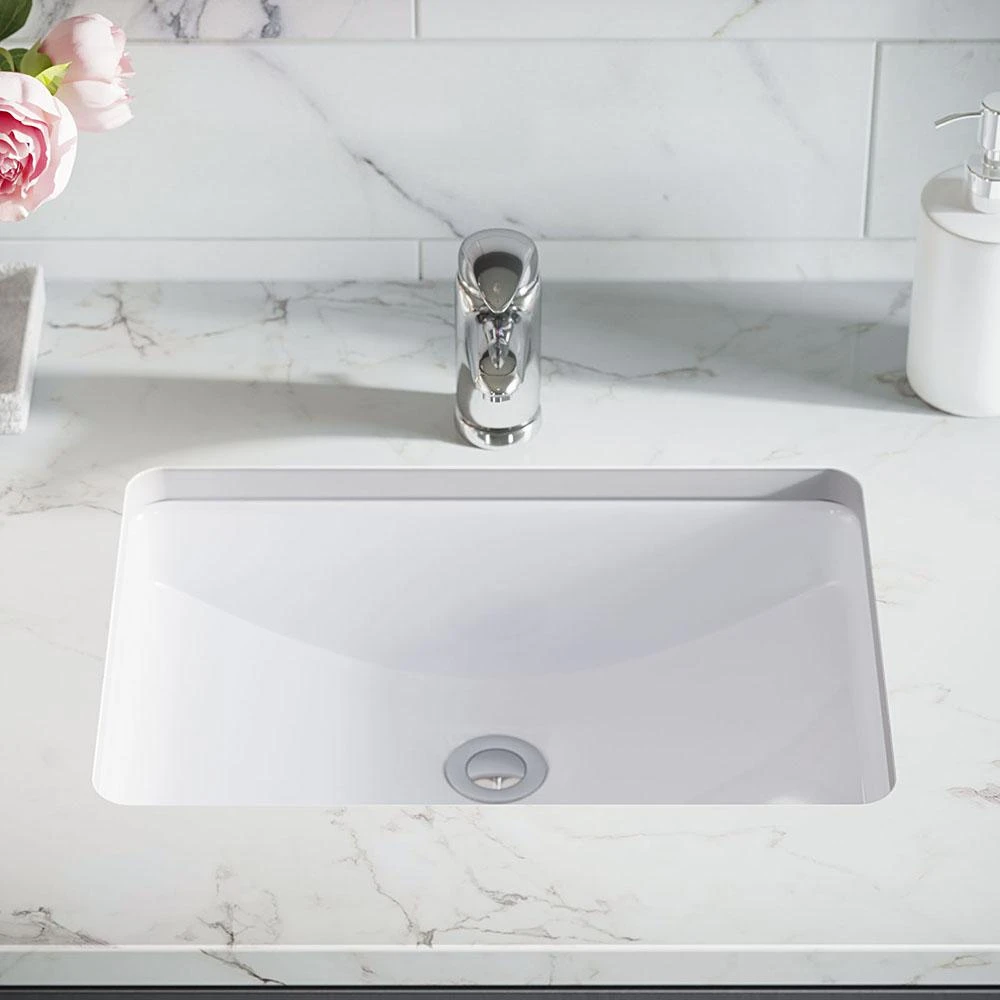 A glamorous example of porcelain’s functionality and durability shines in this rectangular, deep-bowl form with an overflow hole to prevent excessive filling. This model also features an offset drain, allowing for more upfront room below the cabinet. The vitreous china coating creates an even more impervious and sanitary surface. This sink can be mounted under a laminate countertop with the included SinkLink installation piece. Offered in white, black or gray, the SinkLink is perfectly shaped to conjoin the undermount sink and laminate countertop into a flushed and flawless finish. Constructed from a thick durable plastic, SinkLink acts as a secure barrier that keeps the foundation of the laminate countertop dry. With an overall measurement of 20-3/4 in. x 14-3/4 in. x 7-3/4 in., this sink requires a 24 in. minimum cabinet size. Additionally, a spring-loaded, pop-up drain is included, which opens and closes with a simple press to It is attractive chrome cap.