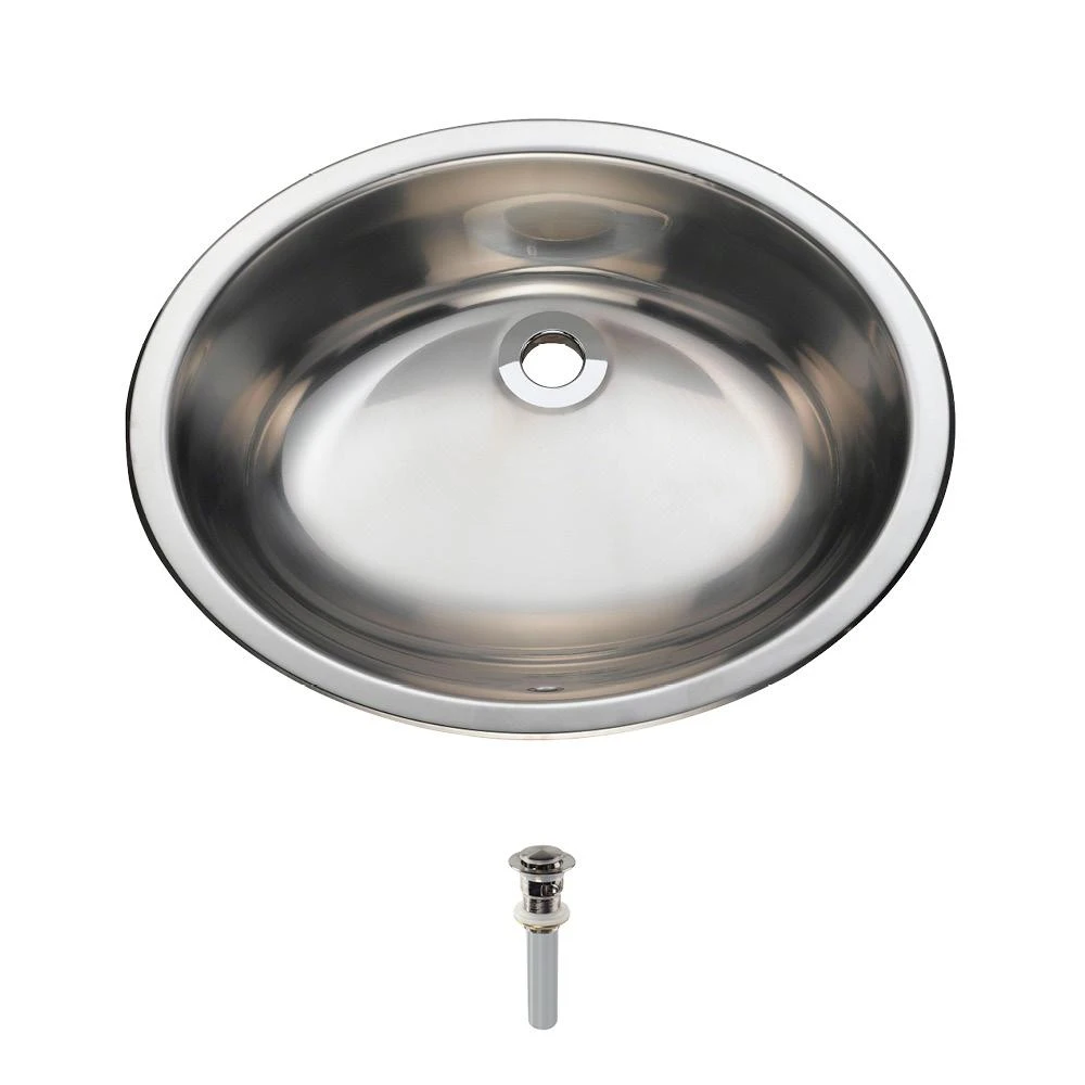Stainless steel is not reserved exclusively for kitchen sink designs. This model is a smart, stylish choice in this glamorous metal for the bath. Durable and functional, this oval-shaped sink has a flattened bottom, and can be mounted either over or under the counter. It also features a dual-layered construction in order to provide an overflow for safe filling. This model is 304-grade, cold rolled steel, at the industry standard 18-Gauge thickness. The surface is given a brushed-satin finish which adds to its luster and masks minor scratches which could occur over time. With an overall measurement of 19-1/4 in. x 16-1/4 in. x 7 in., it will require a minimum-width cabinet of 21 in. It is cUPC certified. Additionally, a spring-loaded, pop-up drain (pud) is included, which opens and closes with a simple press to its attractive brushed nickel cap.