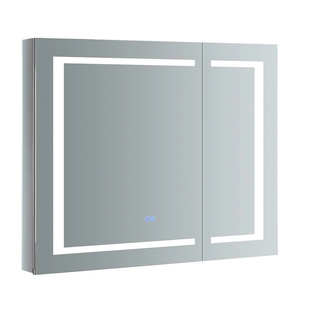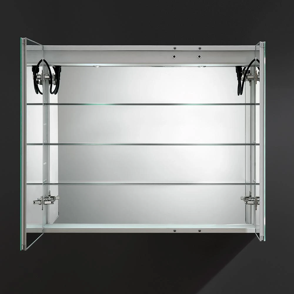 The Fresca Bathroom Medicine Cabinet comes with everything you need to create an elegant and modern bathroom, with every convenience right in front of you. On the outside, its a sophisticated mirrored medicine cabinet with a built-in dimmable surface LED task light which creates an illuminated frame within the mirror. It also has a defogger feature. Inside, there’s an LED light and a handy electrical/USB outlet combo for an electric shaver, toothbrush or other essentials. The interior features 3 adjustable glass shelves and a mirrored back wall. The double-sided mirrored doors swing 170°s on soft-close BLUM hinges. Measuring 36 in. W x 30 in. H x 5 in. D, this medicine cabinet is available in several sizes.